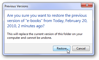 It is simple to access previous versions of any file or folder on your Windows computer. Simply open any Explorer window, right-click on a file or folder you wish to restore, and select “Restore Previous Versions.” For instance, if you accidently deleted a file from a folder in My Documents, browse to that folder and open previous versions from it. Please note that this will only appear on files and folders, not drives or Libraries.