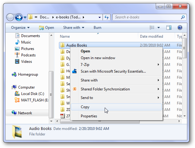Or, choose Open to browse the contents of the folder as it appeared at that time. You can open, copy, or do anything you choose with the file from here. For instance, if I deleted the Audio Books folder accidently today, I could click copy, and then past it into my normal e-books folder in my Documents folder.